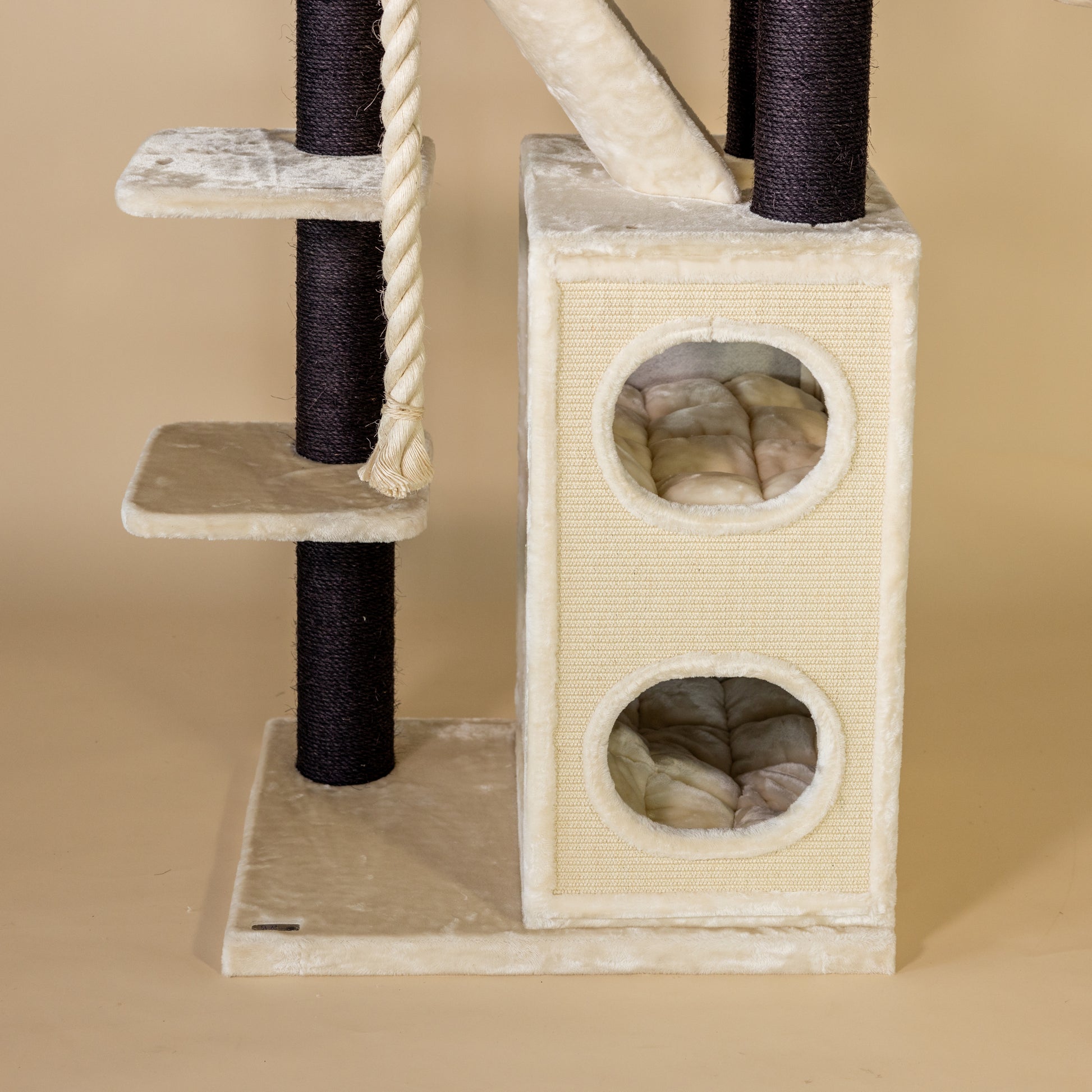 The Cat Penthouse Blackline Crown Cream Cat Tree, with its 12 cm thick sisal poles and large scratching barrel of natural sisal, is a true cat paradise. The large lounge lying area, 45 cm wide hammock, Super de Luxe Crown and 80 cm large scratching barrel give your large cats plenty to explore!