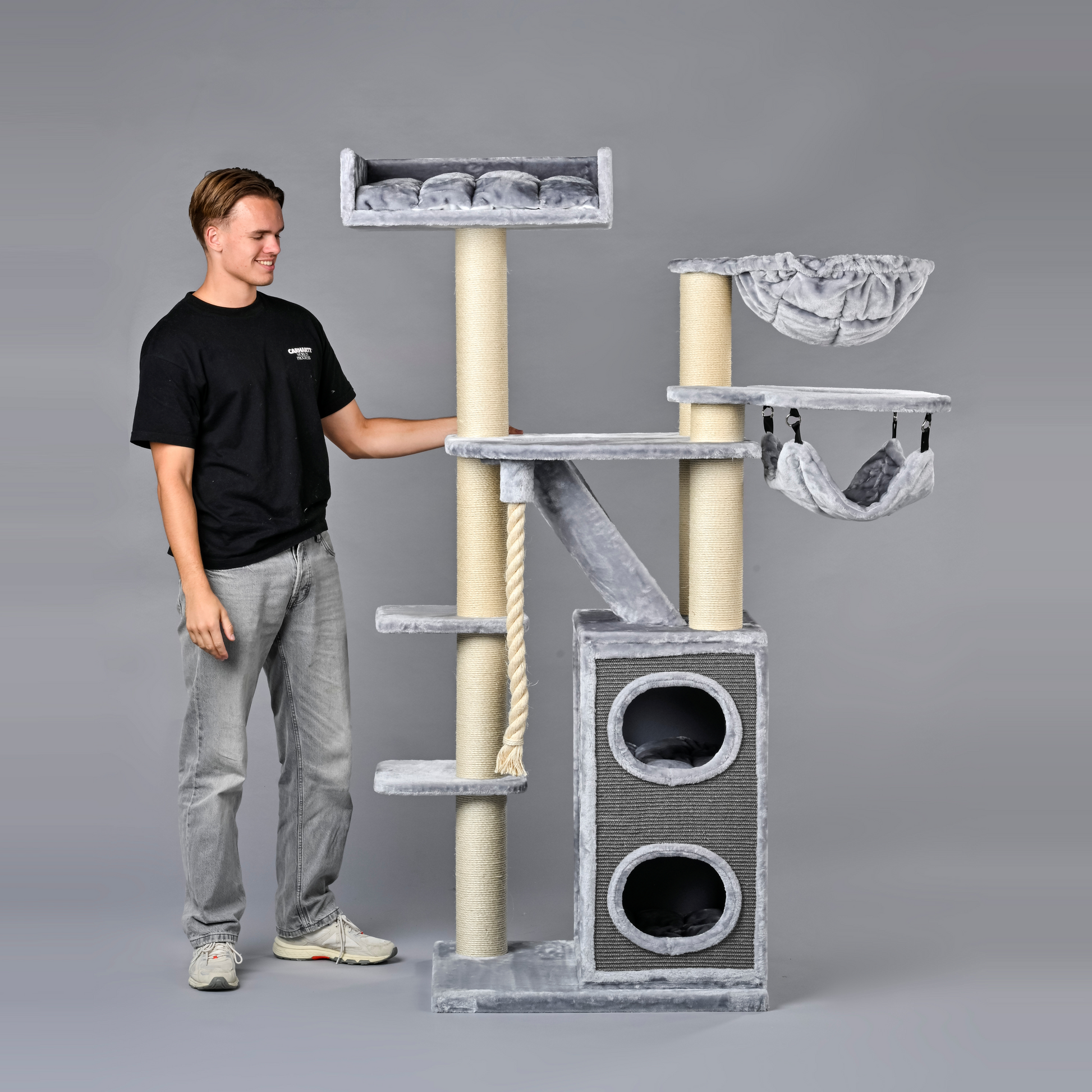 The cat tree contains many features for your cat to go wild on. The 8 ( ! ) sisal poles - which all have a diameter of 12 cm and 6 of which are at least 40 cm tall - give your cat myriad opportunities to scratch and sharpen its nails. All in all, this cat tree contains myriad scratching opportunities, which offers important ergonomic benefits for your cat's joints.