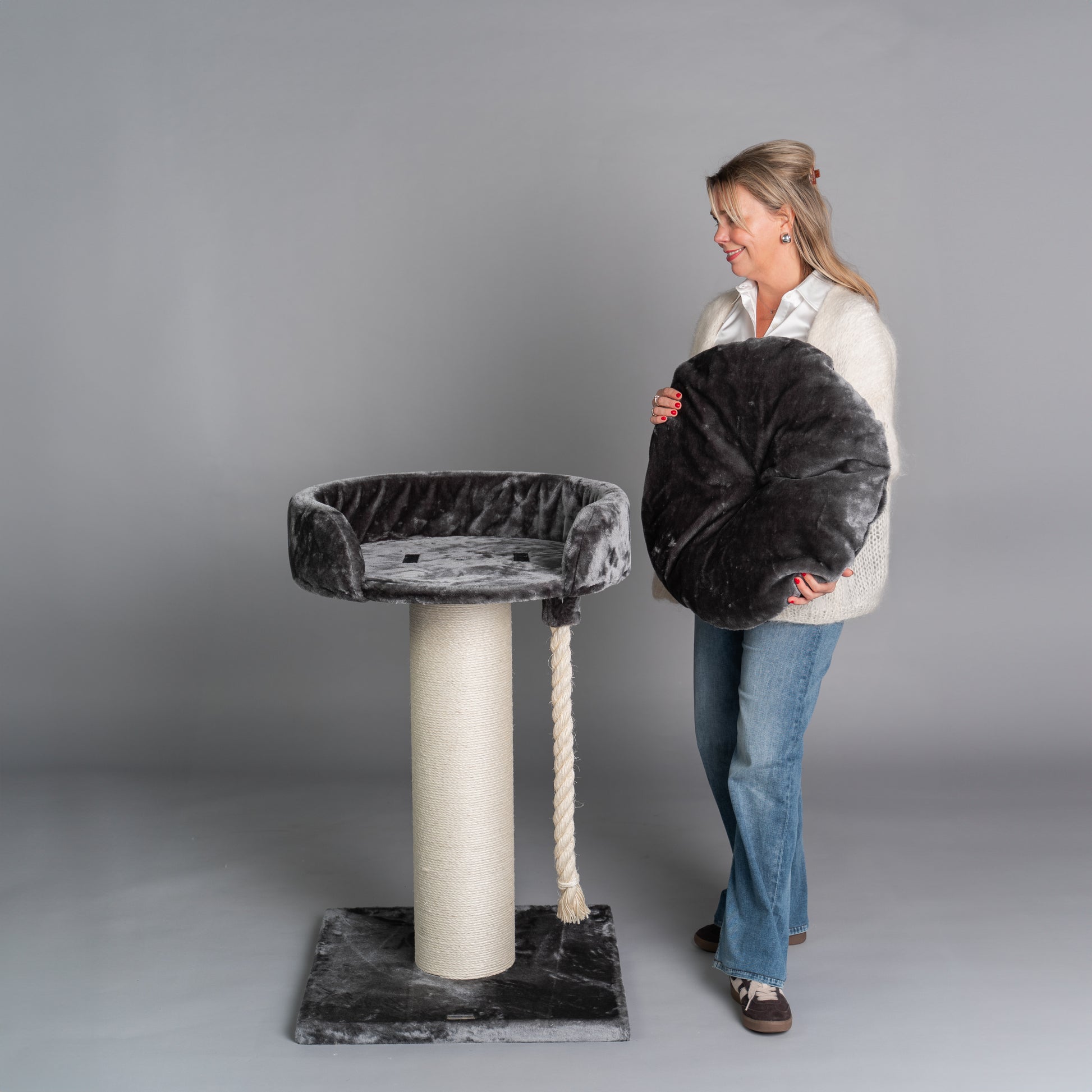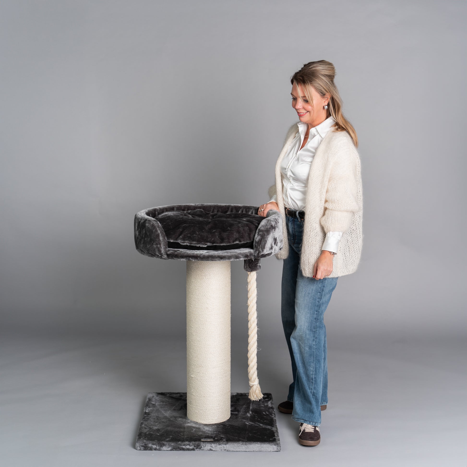 The dark grey Chartreux cat tree, with its 80 cm high and 20 cm thick sisal pole, is one of RHR Pets' strongest and sturdiest cat trees and, therefore, suitable for large and heavy cats. This stylish cat tree has an exceptionally large lying area on top with a 60 cm diameter, on which your cat can stretch out fully.