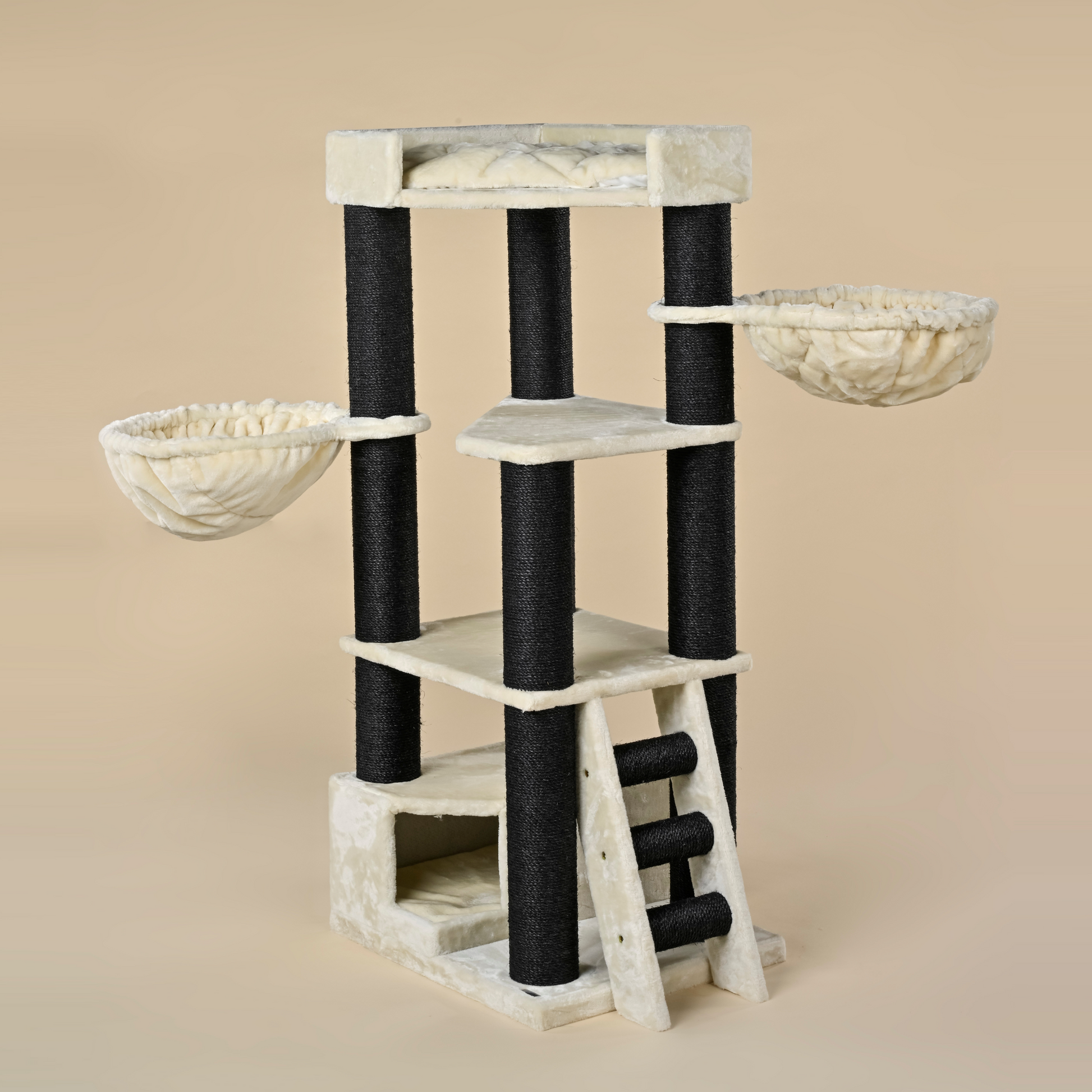 The Corner Coon Blackline Beige cat tree is a customer favourite at RHR Pets. Because of the option to place it as a corner cat tree, the 12 cm thick sisal poles and the many relaxation and play options, this is a cat tree that includes everything. A mega large lounge area, two large 45 cm hammocks and a huge hideaway make the Corner Coon a genuine cat palace!