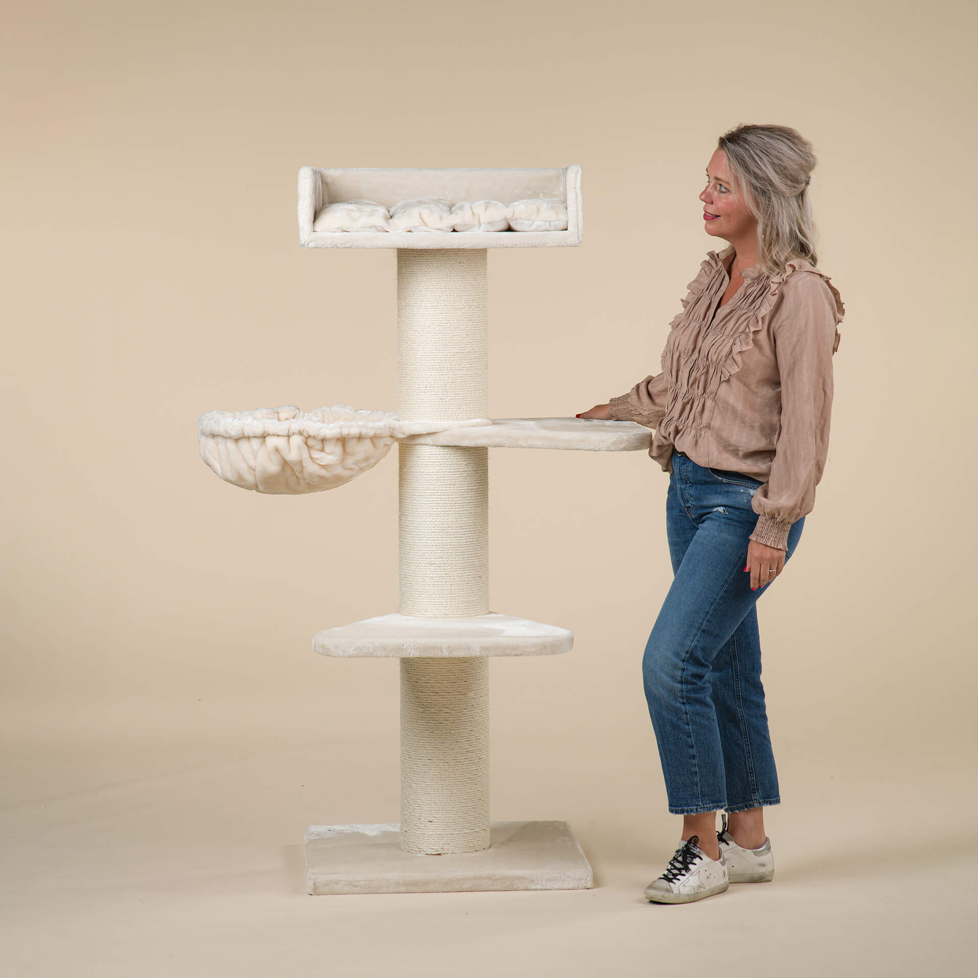 The Royal Cat Tree Royalty Plus Cream, with its 20 cm thick sisal poles, large de Luxe hammock and large lying areas, has been one of the most popular cat trees from RHR Pets for years. This is because of the many scratching possibilities, lying areas, the super large cat Lounge measuring 60 cm wide and its luxurious appearance!