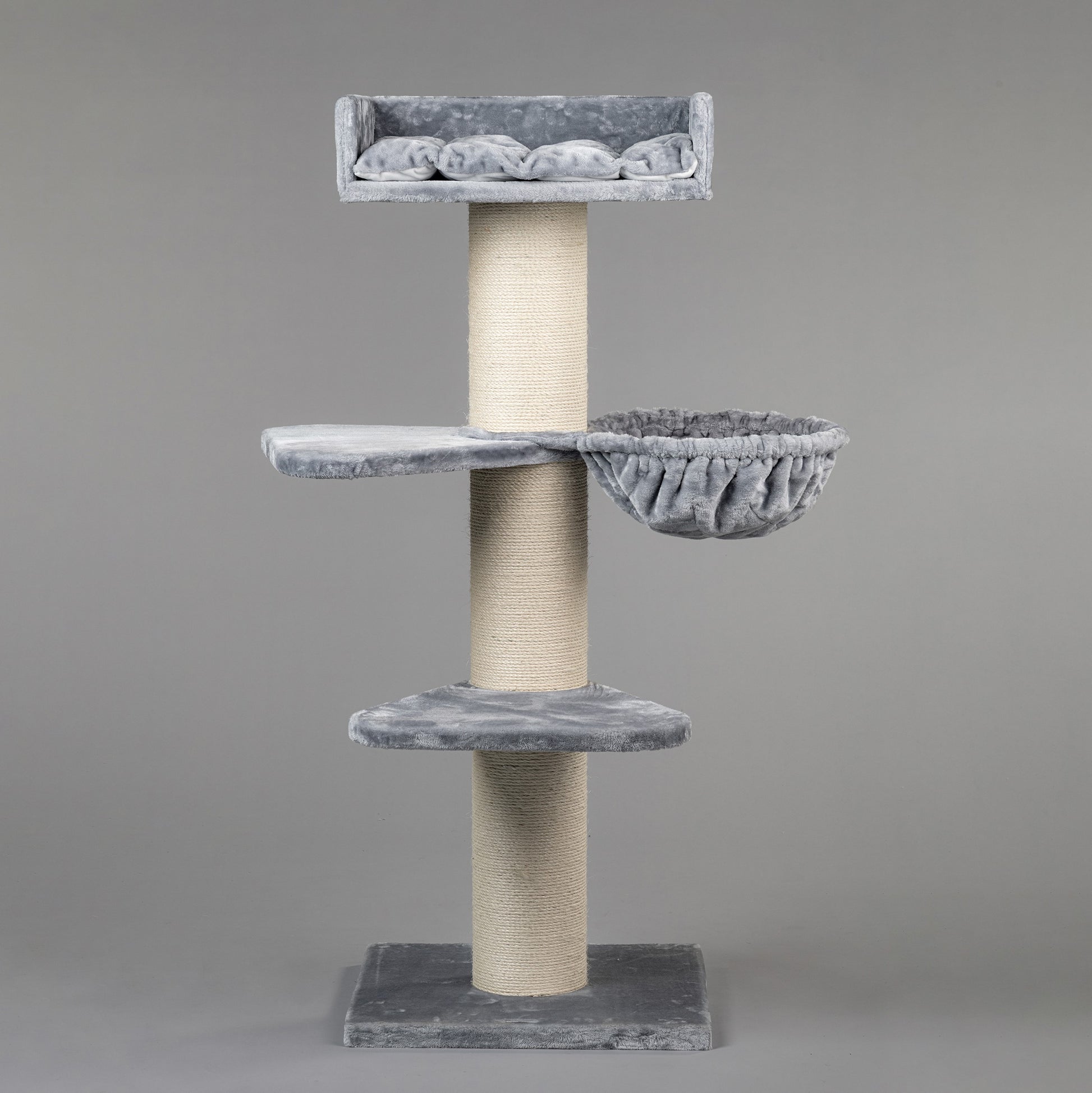 The Royal Cat Tree Royalty Plus Light Grey, with its 20 cm thick sisal poles, large de Luxe hammock and large lying areas, has been one of the most popular cat trees from RHR Pets for years. This is because of the many scratching possibilities, lying areas, the super large cat Lounge measuring 60 cm wide and its luxurious appearance!