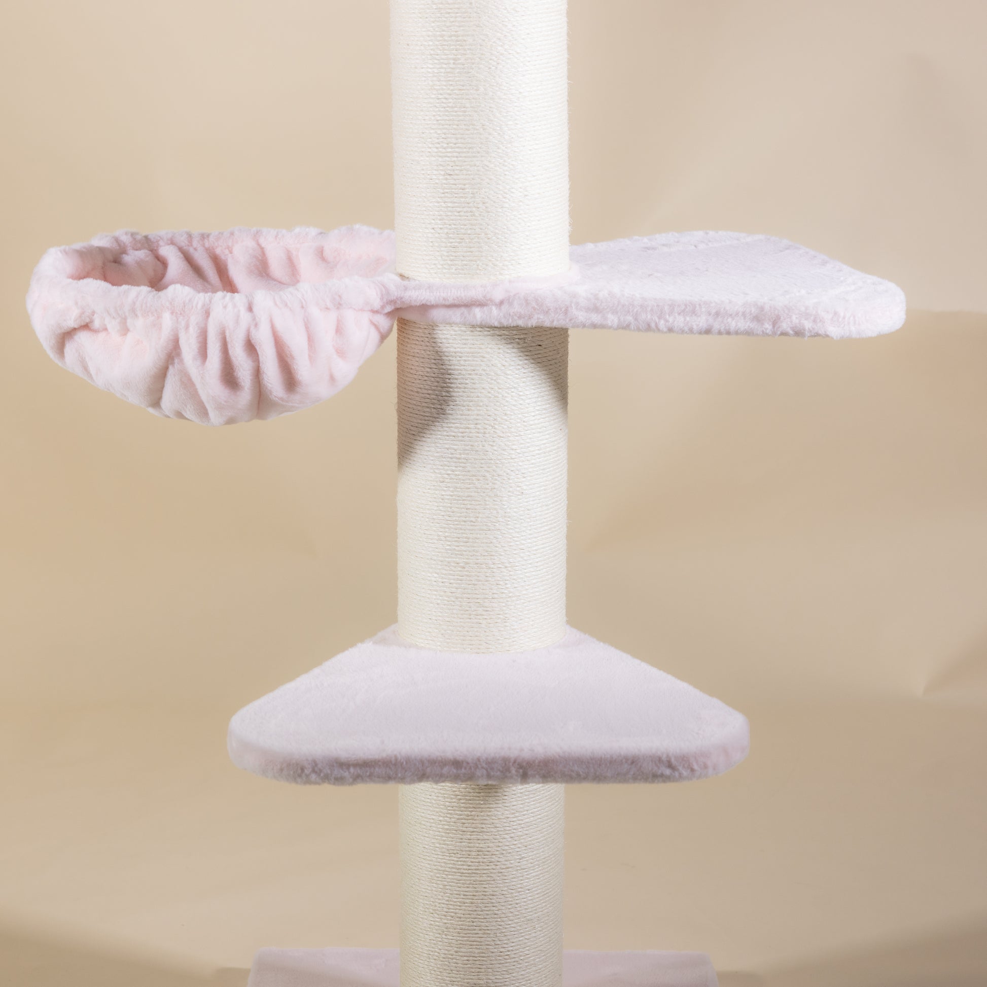 The Royal Cat Tree Royalty Plus Pink Teddy, with its 20 cm thick sisal poles, large de Luxe hammock and large lying areas, has been one of the most popular cat trees from RHR Pets for years. This is because of the many scratching possibilities, lying areas, the super large cat Lounge measuring 60 cm wide and its luxurious appearance!