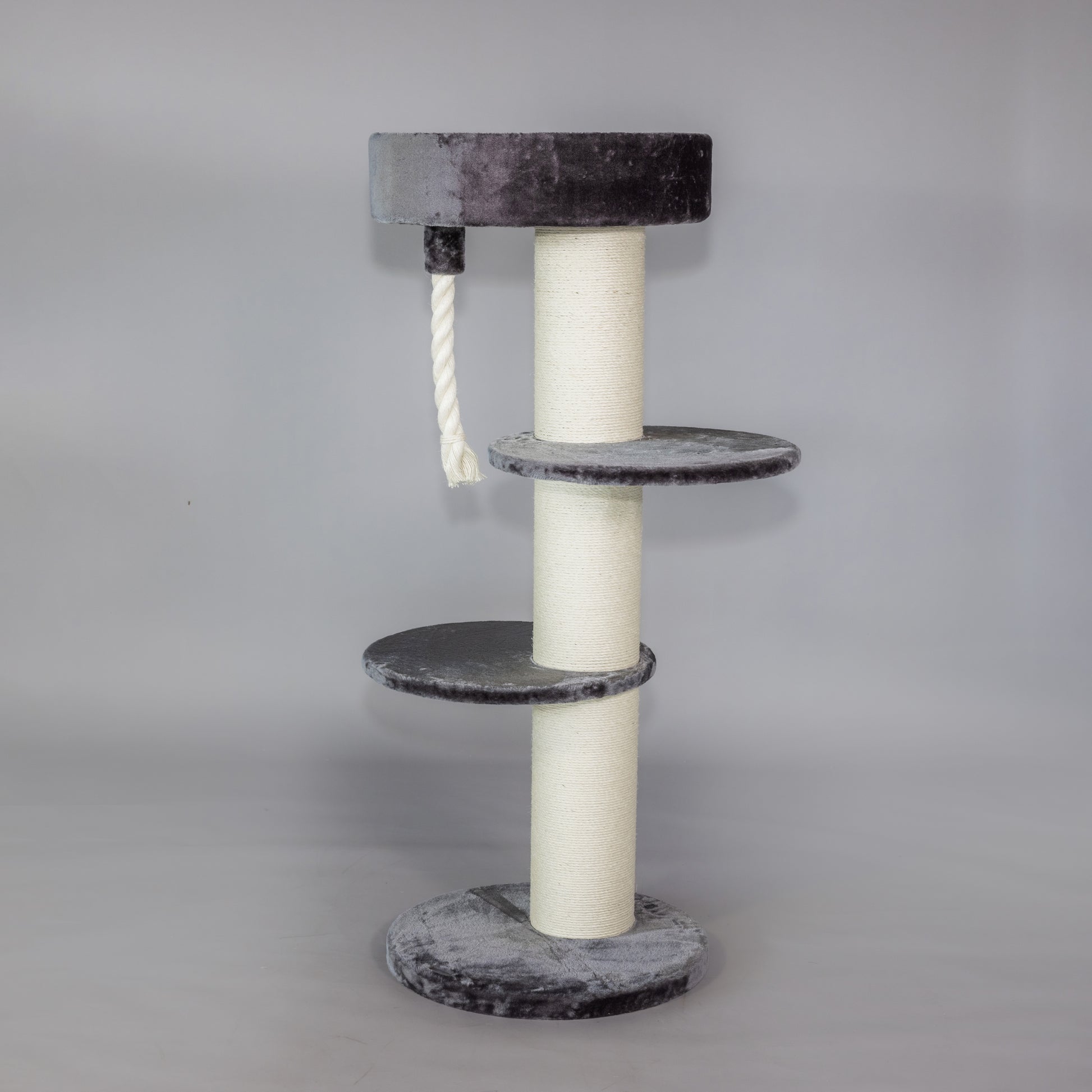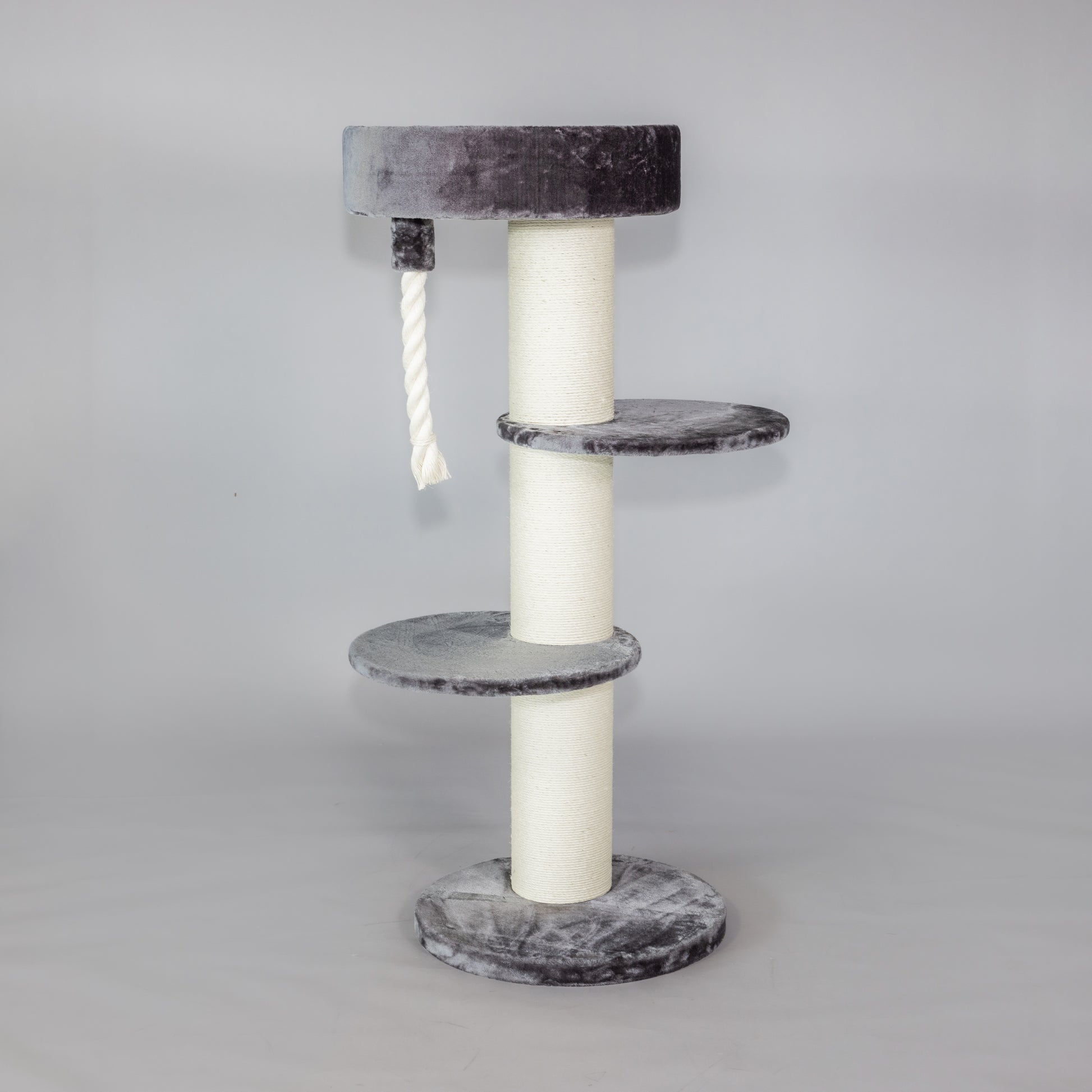 The Maine Coon Sleeper Dark Grey, with its 20 cm thick sisal poles and huge lying areas, is a must-have cat tree for any large cat. The large 60 cm round seat provides even the largest cat breeds with a place to enjoy. Your cat can keep an eye on its domain from the seat, which is approximately 1.5 metres high. This cat tree is completed by a rope made of natural sisal.