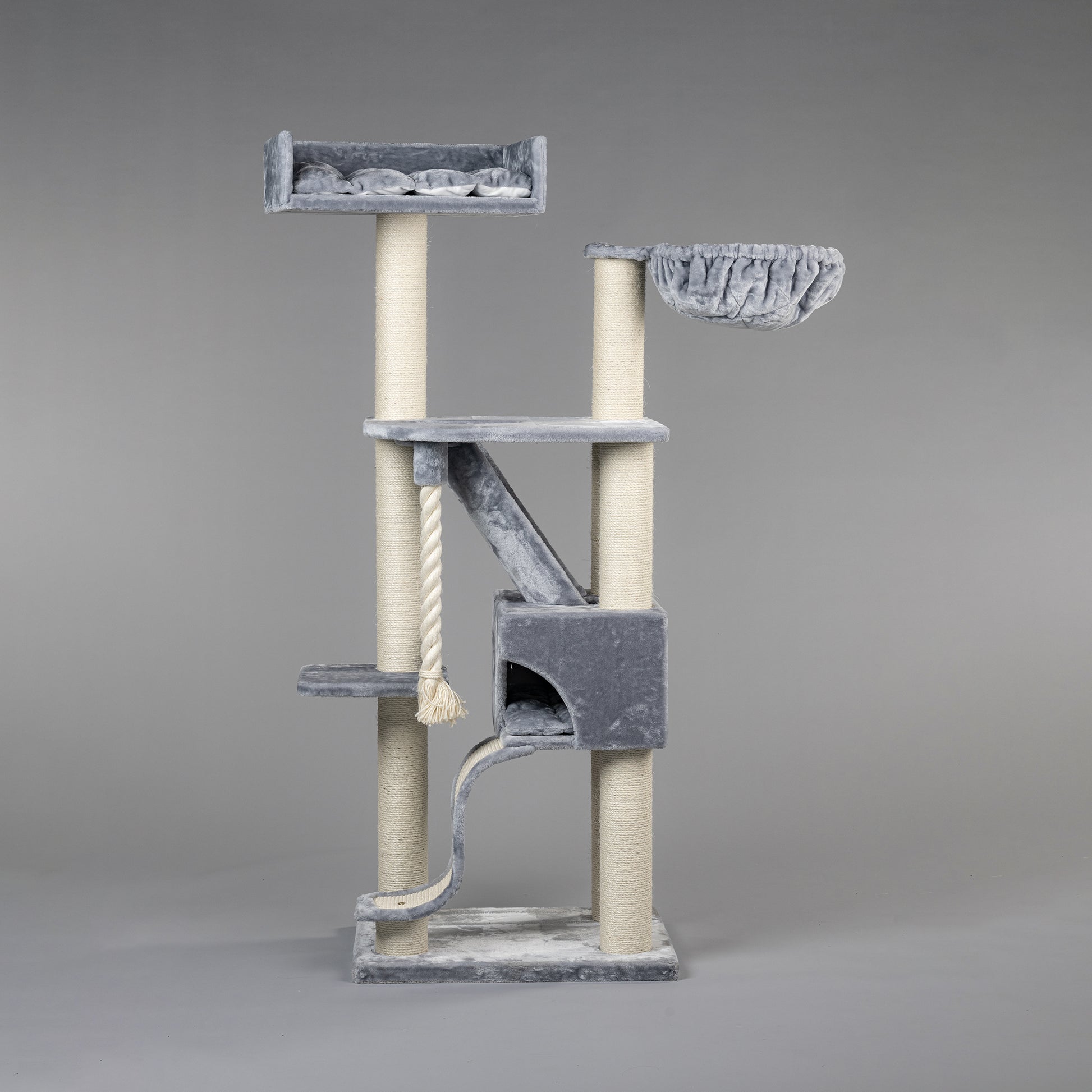 The Kilimandjaro de Luxe Light Grey cat tree is one of the most popular cat trees. Its many lying and playing areas are every cat's dream. The sisal poles are 12 cm thick, making it very stable and sturdy. It also has a large lounge lying area of 60 cm x 43 cm, a lovely soft 45 cm hammock and a huge hideaway, making it suitable for large (pedigree) cats and energetic kittens.