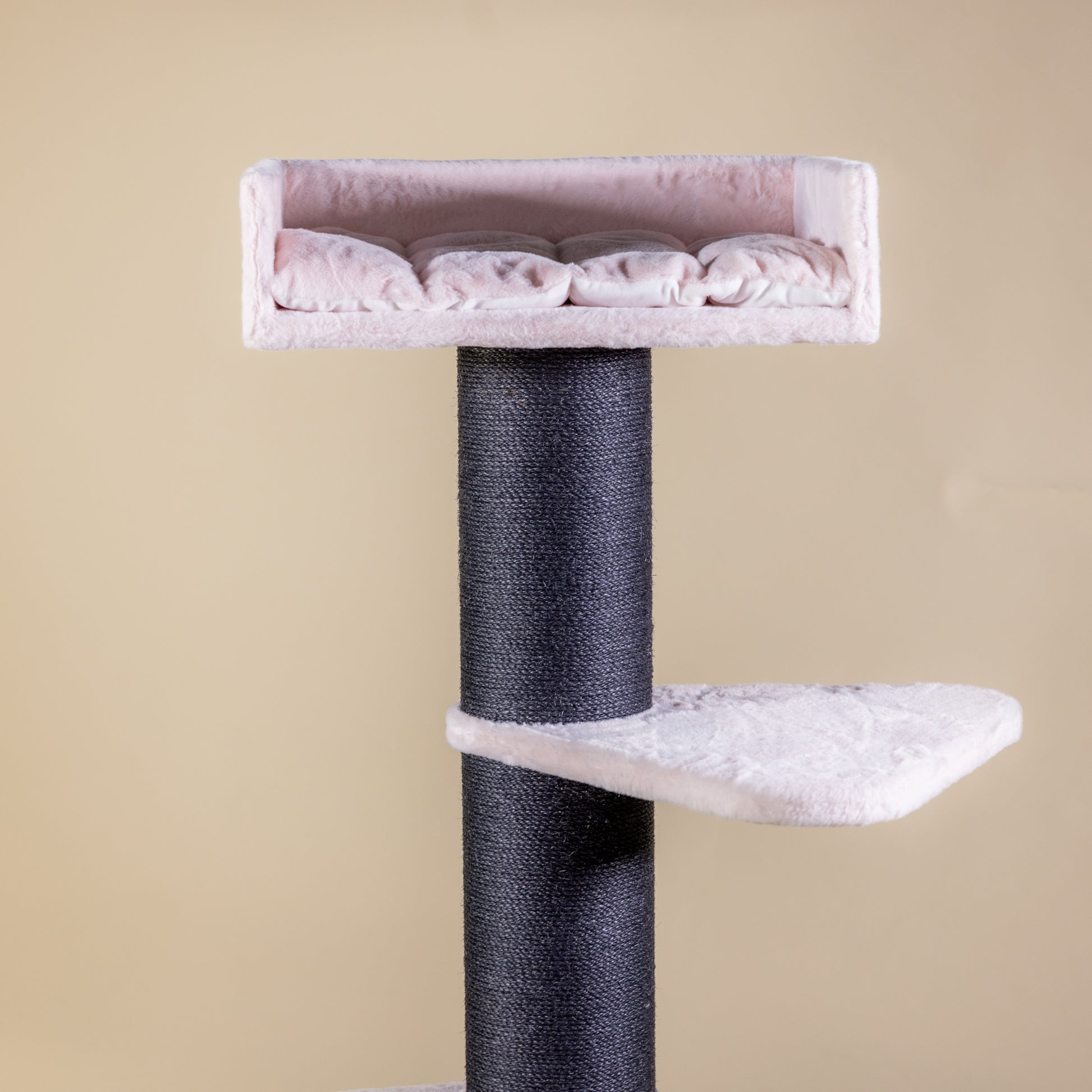 The Royal Cat Tree Royalty Blackline Pink Teddy , with its 20 cm thick sisal poles and large lying areas, has been one of the most popular cat trees from RHR Pets for years. This is because of the many scratching possibilities, lying areas, the super large cat Lounge measuring 60 cm wide and its luxurious appearance!